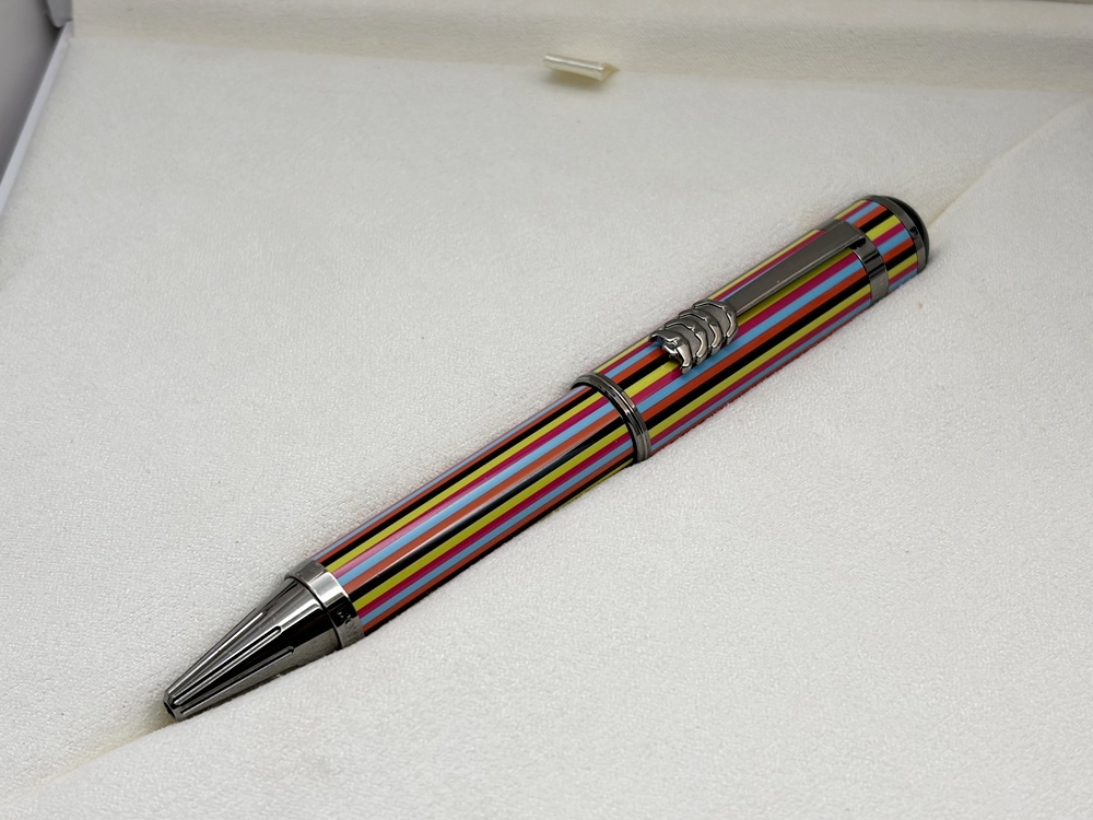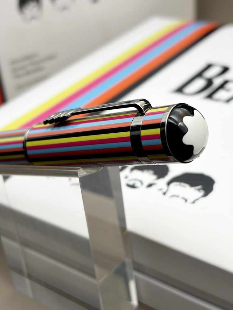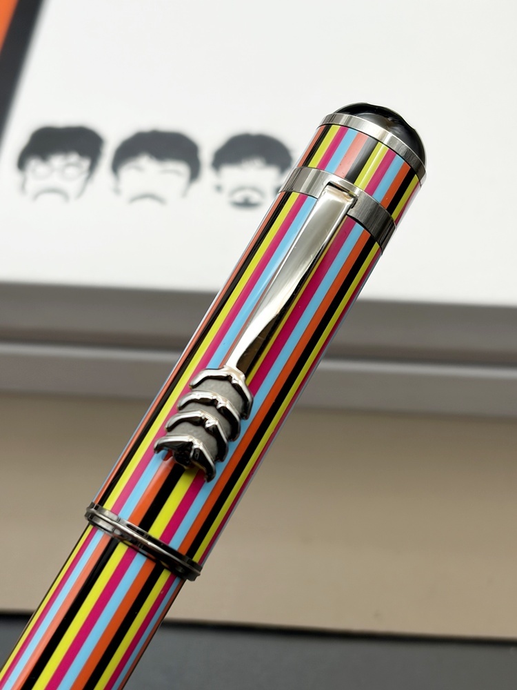 Der Montblanc Great Characters The Beatles Kugelschreiber ist eine farbstarke Hommage an die kreativste Phase der Fab Four. Mehrfarbig lackierter Schaft und Kappe zitieren die ikonischen Bühnen- und Plattencover-Outfits – von Love Me Do bis Sgt. Pepper’s Lonely Hearts Club Band. Der Clip greift als stilisiertes Detail den berühmten Beatles-Schnurrbart auf; Kappenkopf und Konus verweisen auf die Aufnahmetechnik in den Abbey Road Studios (Mikrofon-Anmutung am Kappentop, Konus nach Mischpult-Regler gestaltet).