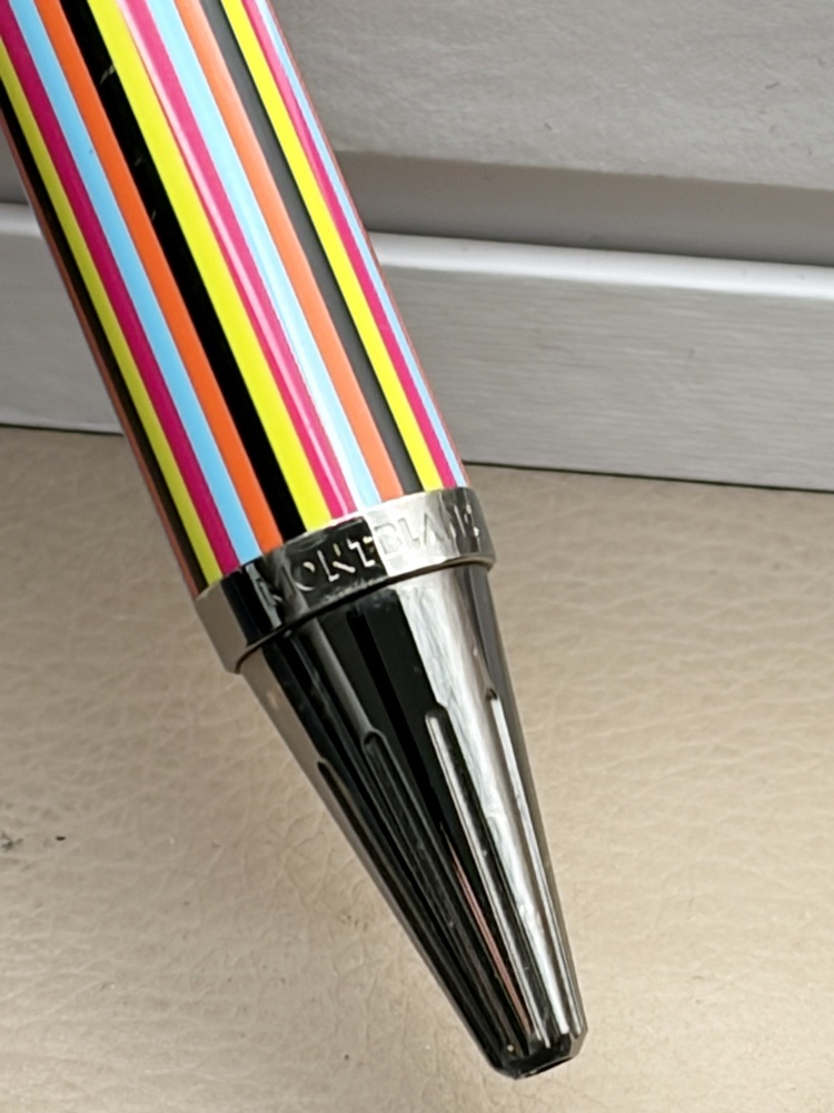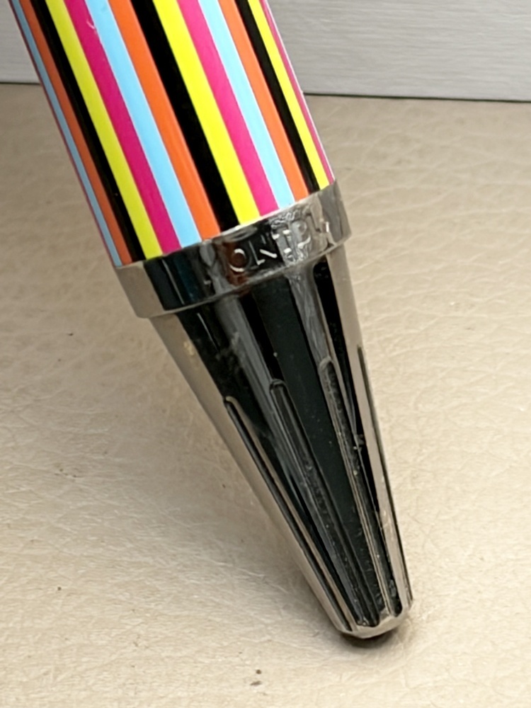 Mehrfarbiger Lack auf Schaft & Kappe; markante Streifenoptik