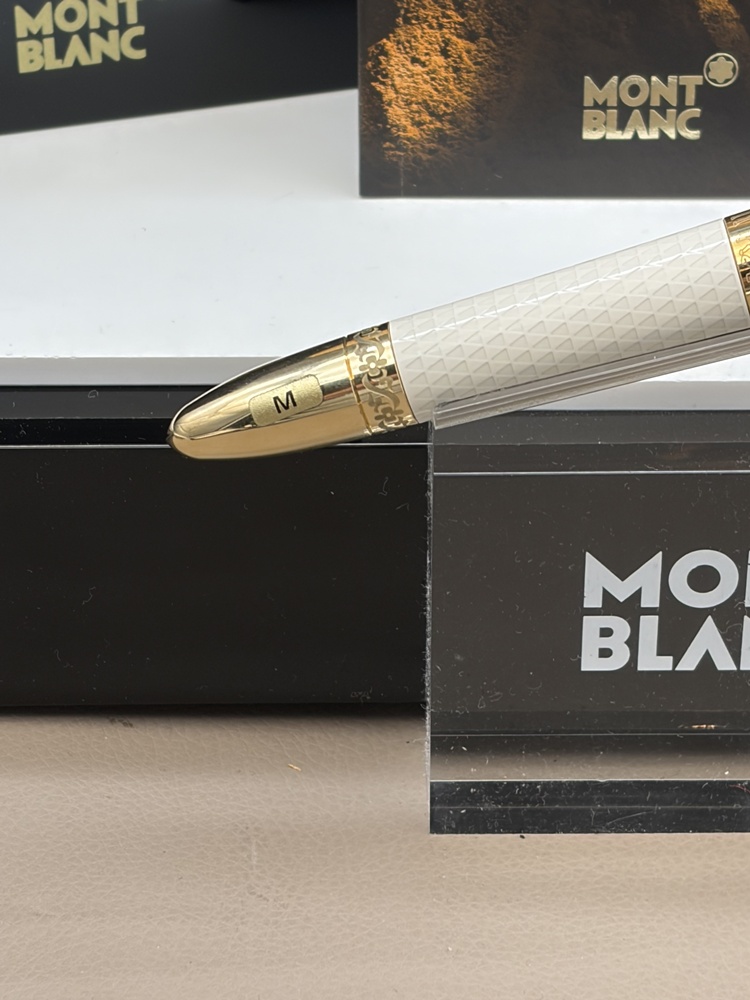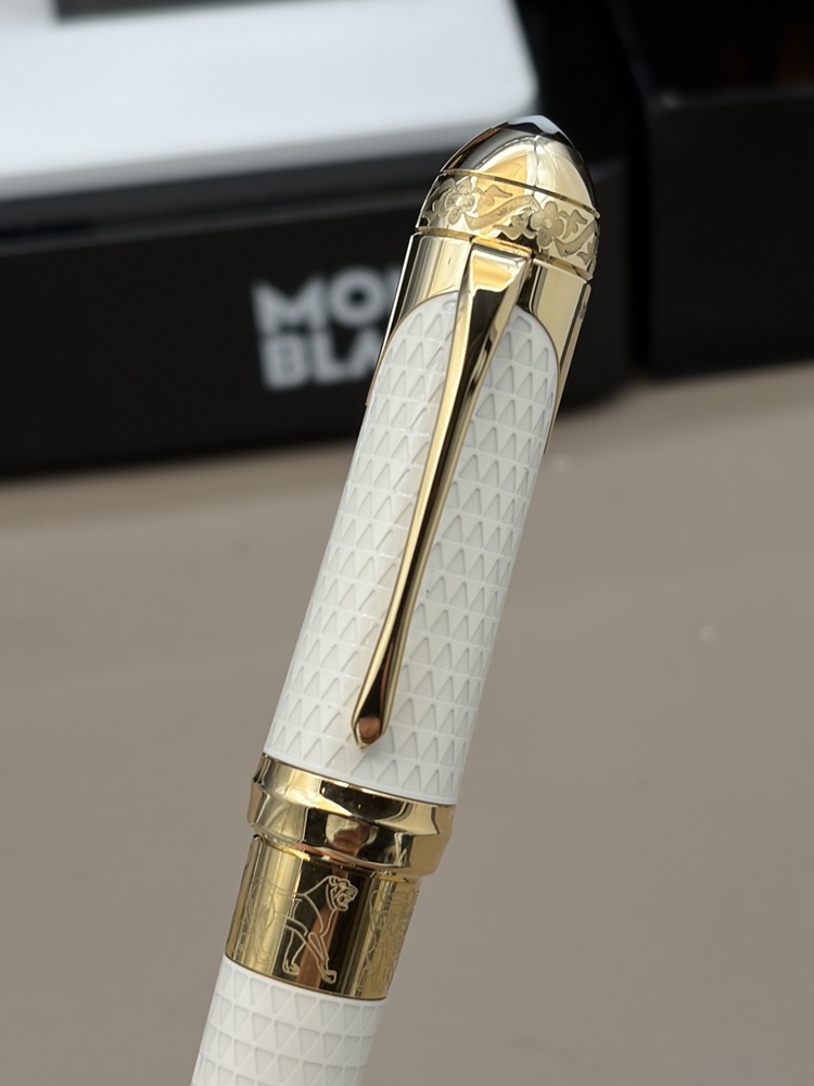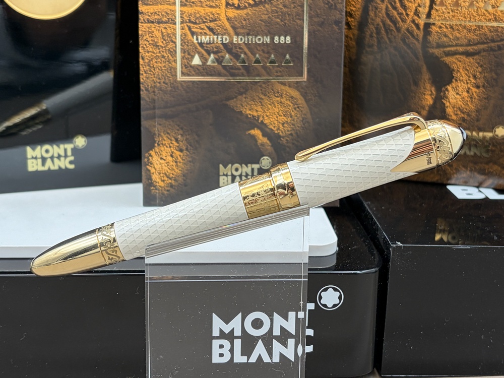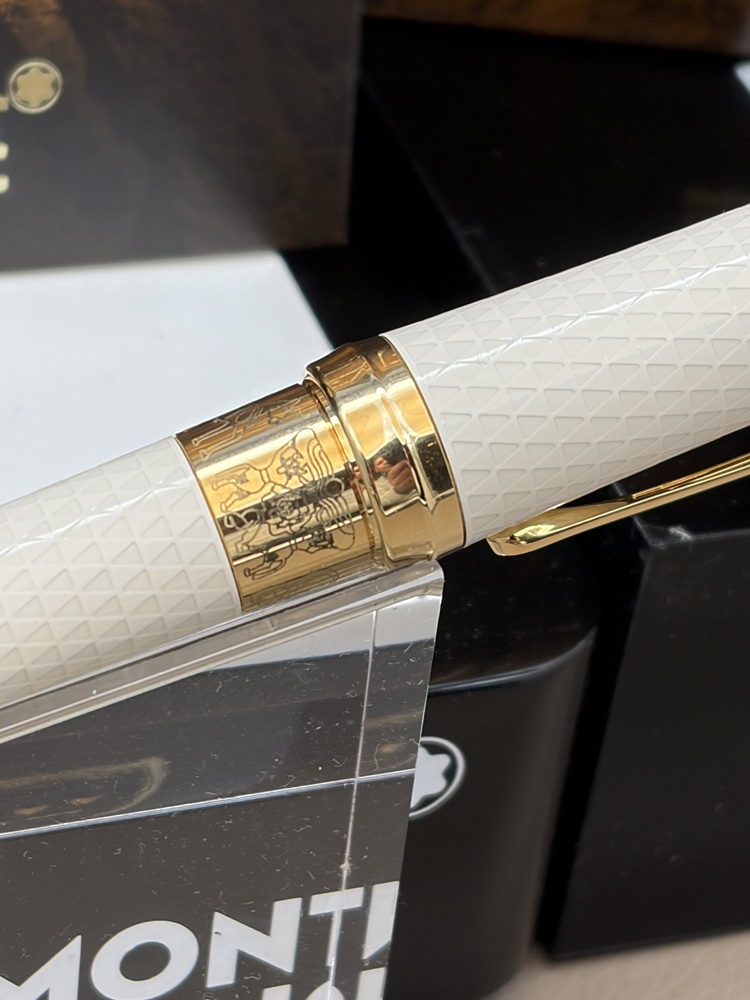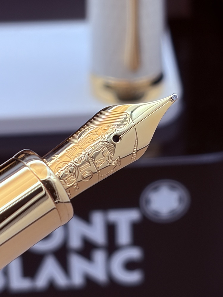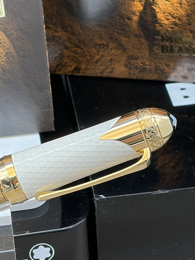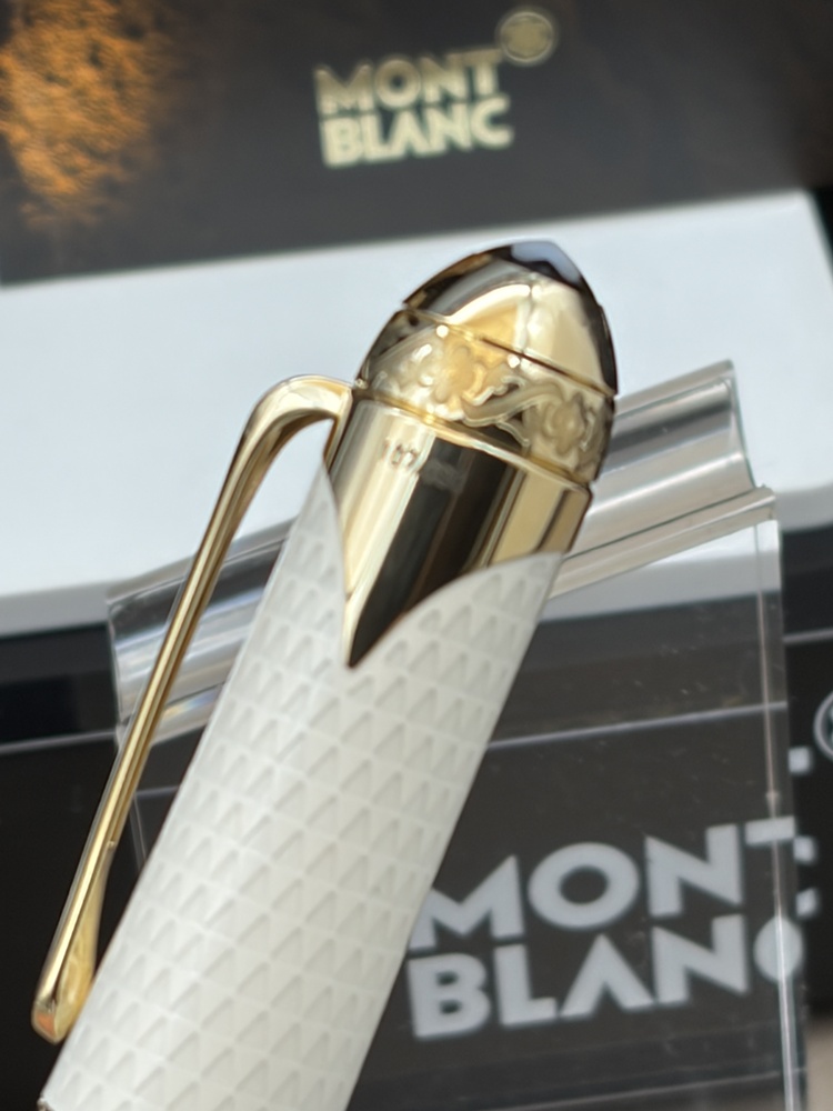 Gefertigt aus edelsten Materialien, präsentiert sich der Korpus in einem faszinierenden Zusammenspiel aus kunstvoll gravierten Mustern und feinen Verzierungen, die an orientalische Ornamentik erinnern. Die Kappe ziert ein aufwändig gearbeitetes Design, während das Montblanc-Emblem in schimmerndem Edelharz stilvoll den krönenden Abschluss bildet.