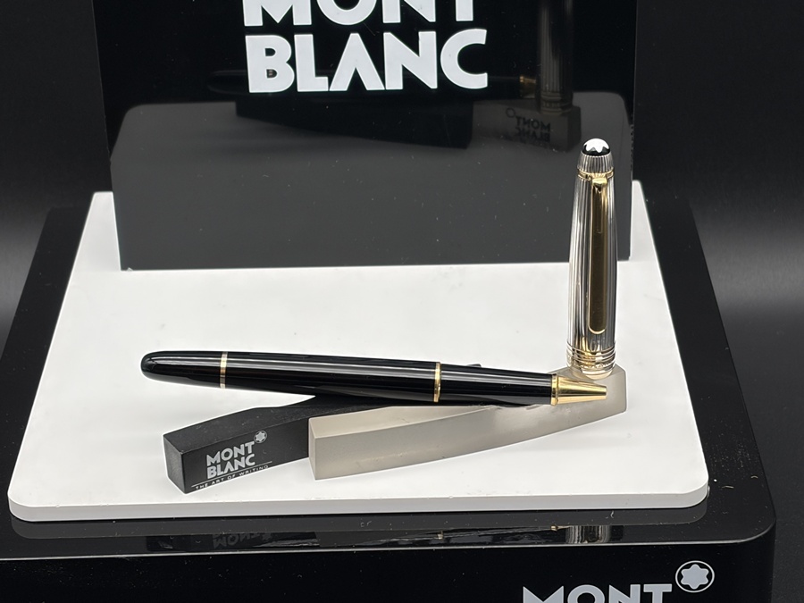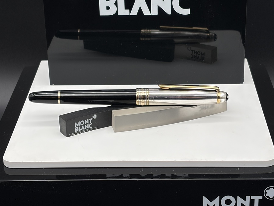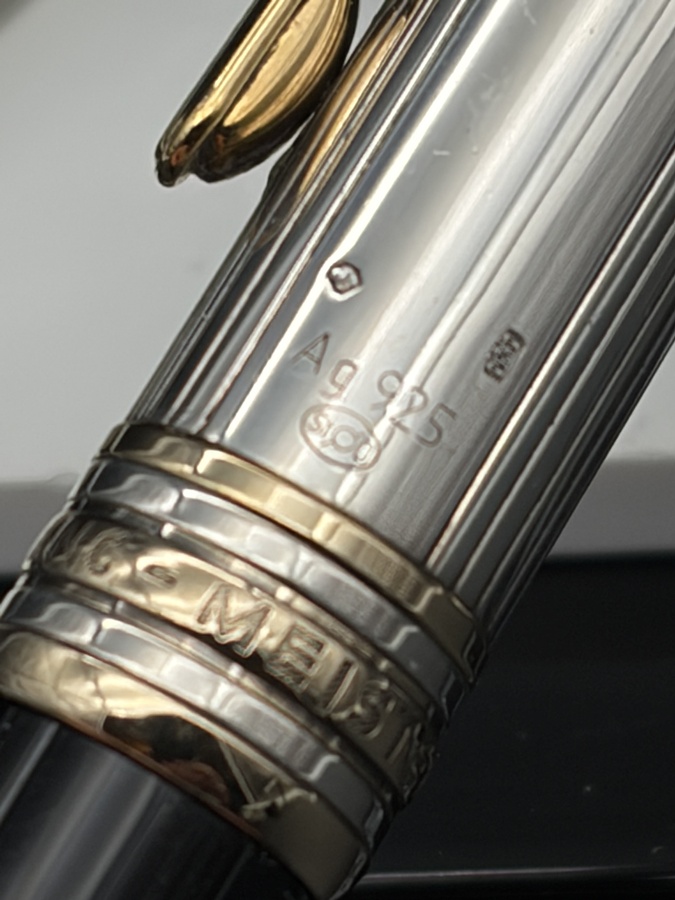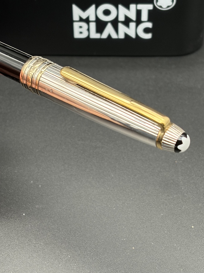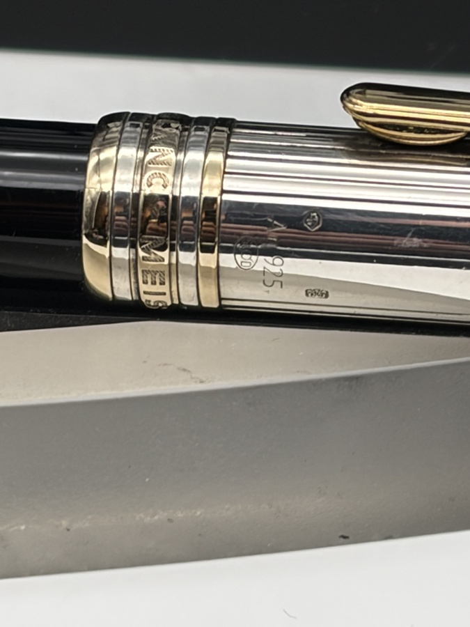 Der Korpus in Edelstahl wird von einer 925 Sterling Silber Kappe gekrönt, das Licht in kleinste Facetten bricht und dem Stift eine dezente, aber sofort erkennbare Präsenz verleiht. Das weiße Montblanc-Emblem auf der Kappenspitze, platinierte Zierelemente und der gravierte Schriftzug unterstreichen den klassischen Meisterstück-Look in einer besonders luxuriösen Interpretation.