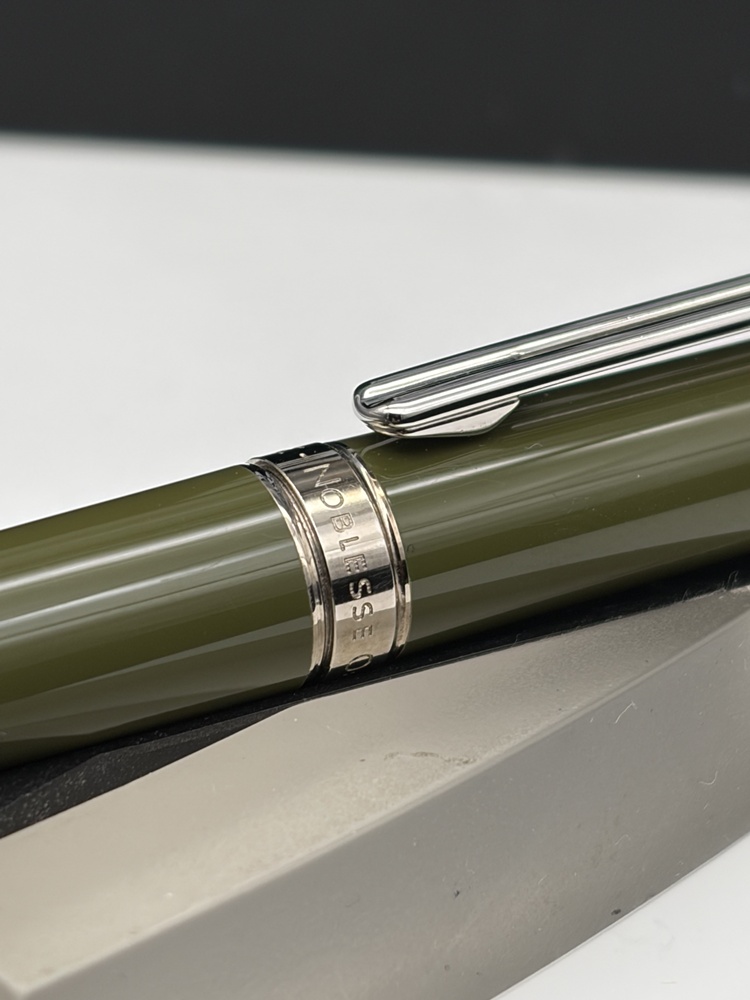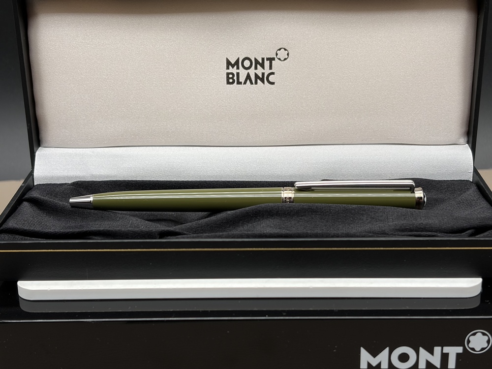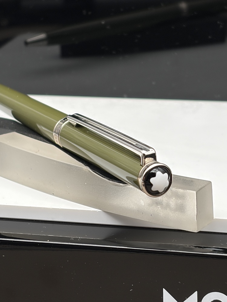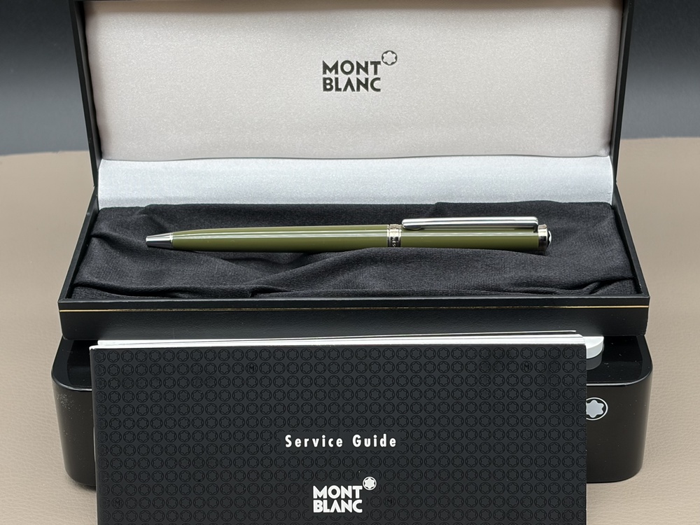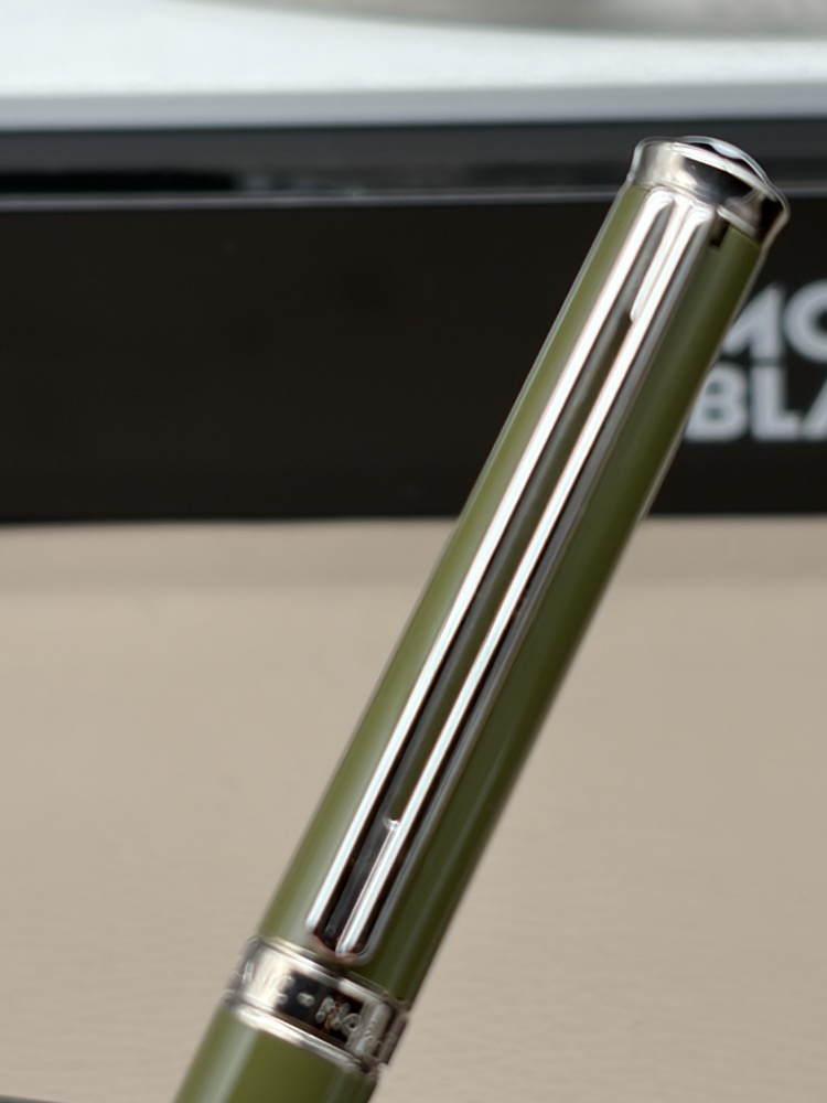 Das Modell in Olivgrün besticht durch seine außergewöhnliche Farbgebung: ein warmer, leicht schimmernder Grünton mit seidigem Glanz, der je nach Lichteinfall unterschiedliche Nuancen zeigt.Die Oberfläche ist glatt und fein poliert, während die vergoldeten oder platinierten Zierelemente – je nach Ausführung – einen stilvollen Kontrast bilden. Der Clip trägt das klassische Montblanc-Emblem in Weiß auf schwarzem Hintergrund, das dezent den noblen Charakter dieses Schreibgeräts unterstreicht.