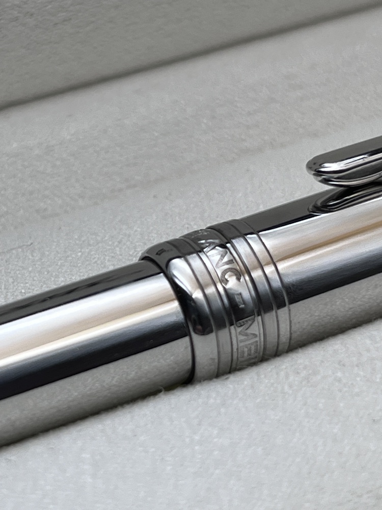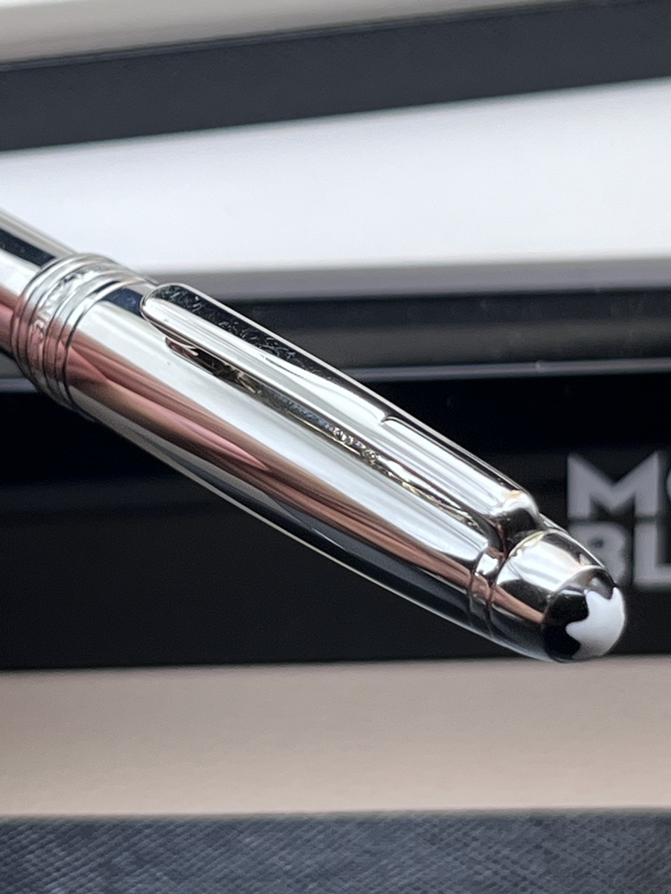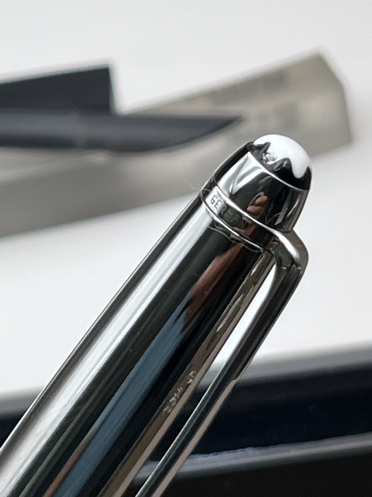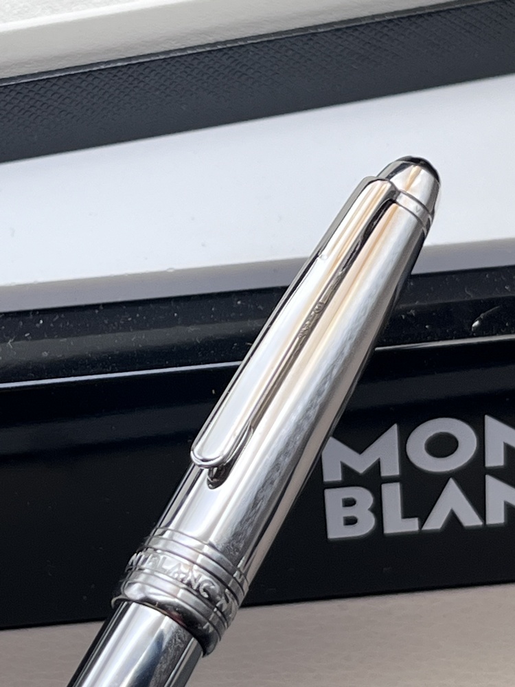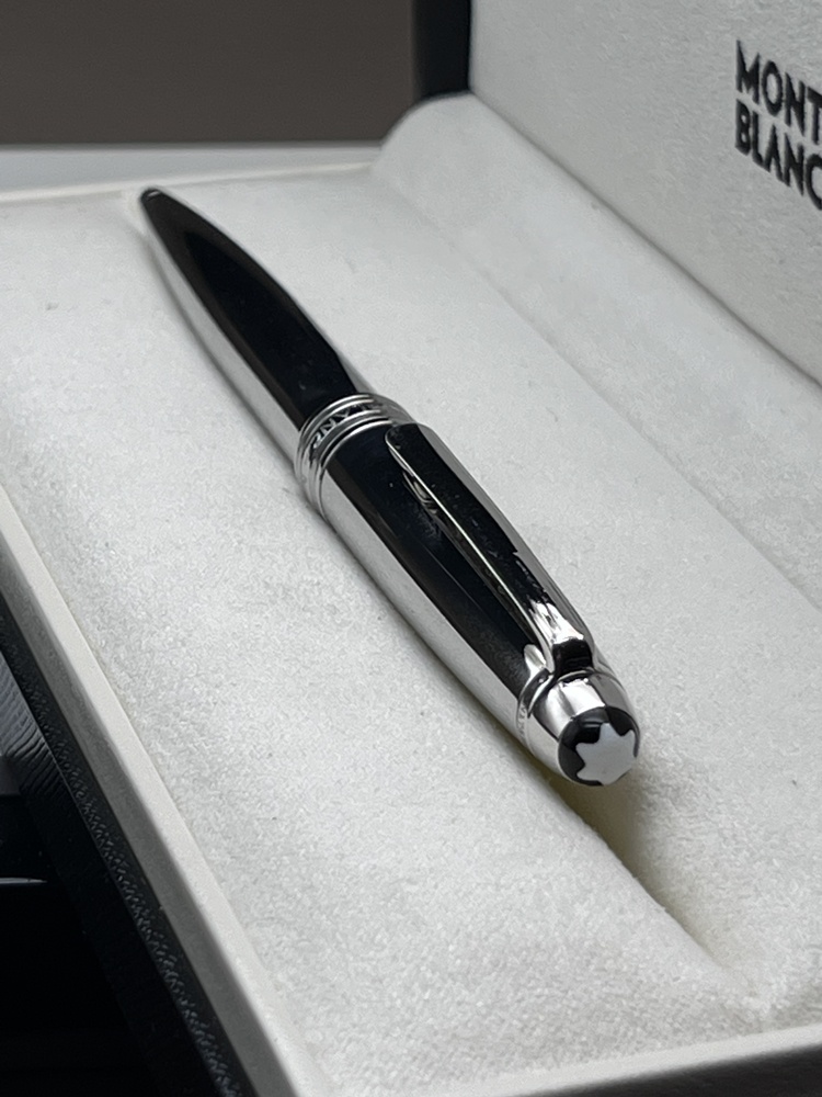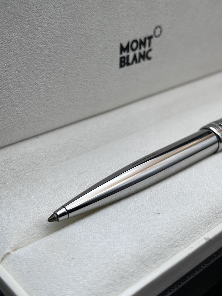 Der elegante Schaft aus Edelstahl mit platinierten Zierteilen und dem charakteristischen weißen Montblanc-Emblem auf der Kappe gekrönt. Dank seines ausgewogenen Gewichts und der präzisen Drehmechanik bietet dieser Kugelschreiber ein besonders weiches und kontrolliertes Schreibgefühl.